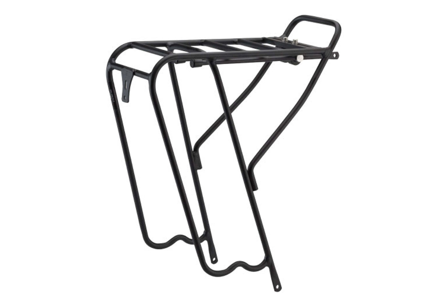 - W-bend at bottom of rack for easy on-and-off of hook-style panniers.